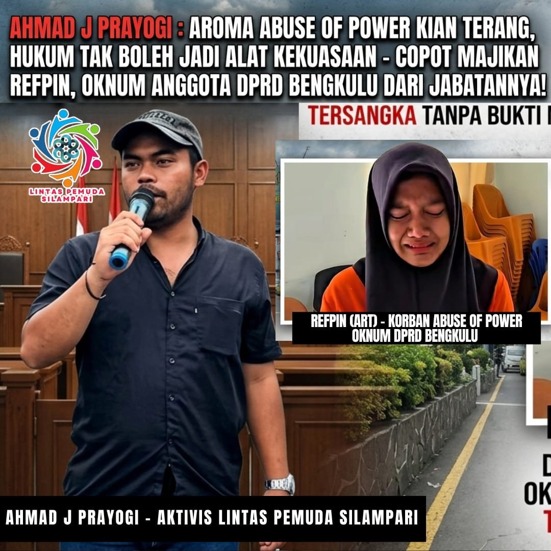 Bengkulu – Koordinator Forum Lintas Pemuda Silampari, Ahmad J Prayogi, menyatakan sikap perlawanan tegas terhadap dugaan ketidakadilan dalam penanganan kasus asisten rumah tangga (ART) di Bengkulu yang menjerat Refpin Akhjana Juliyanti. Ia menilai, semakin banyak fakta yang terungkap justru semakin memperjelas adanya indikasi kuat penyalahgunaan kekuasaan (abuse of power).