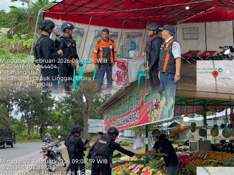 SEGUNTANG.COM, LUBUKLINGGAU — Dalam upaya menjaga situasi keamanan dan ketertiban masyarakat (kamtibmas) tetap aman dan kondusif, personel Satbrimob Polda Sumatera Selatan Batalyon B Pelopor melaksanakan patroli dialogis di sejumlah titik strategis di Kota Lubuklinggau, Minggu (22/02/2026).