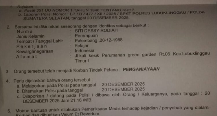 Peristiwa Saat Isi BBM, Istri Almarhum Ketua SMSI Musi Rawas Dianiaya TetanggaLubuk Linggau, News|24/12/2025oleh Redaksi LUBUK LINGGAU,- Seguntang.com – Seorang ibu rumah tangga (IRT) bernama